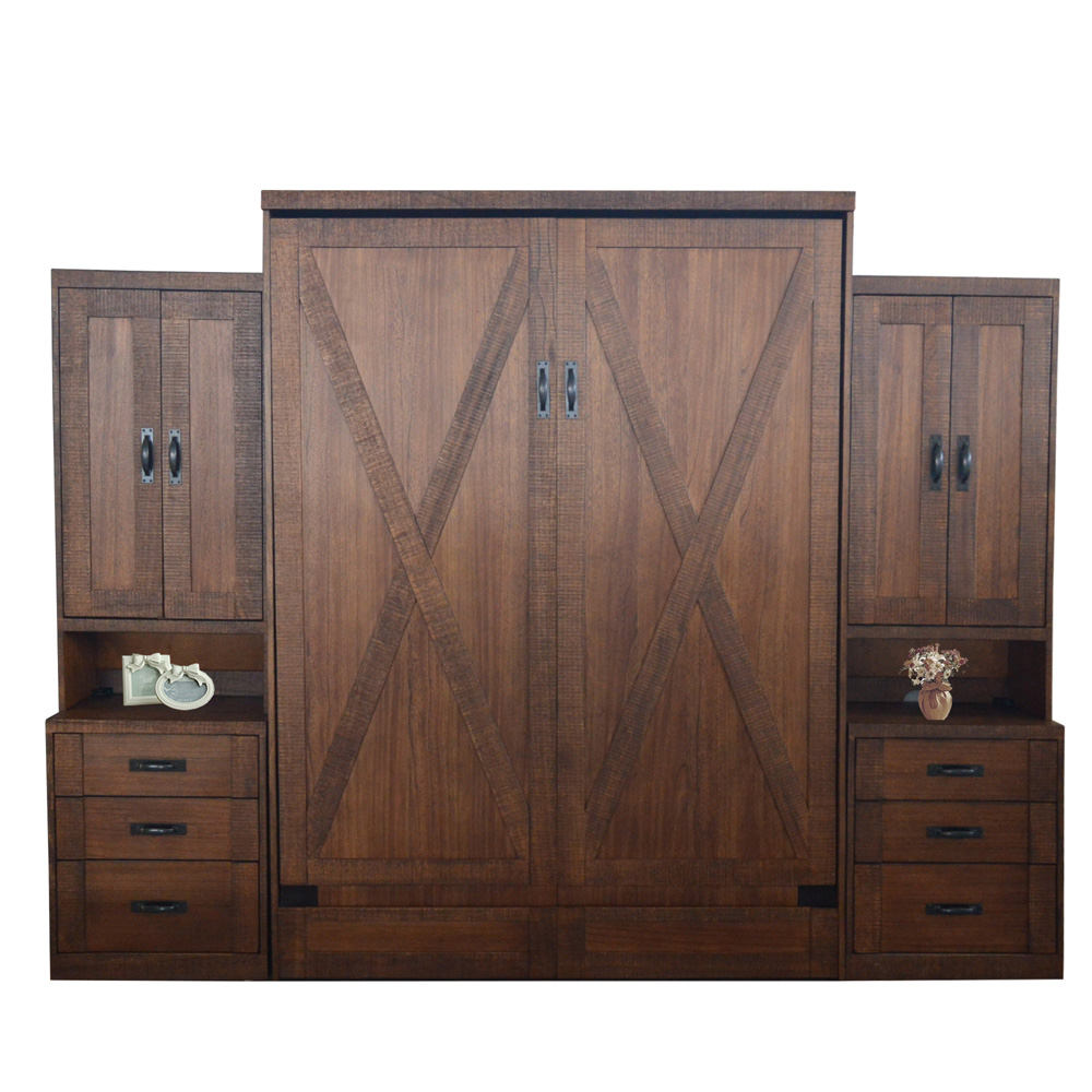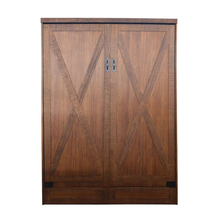 The Barn Door Wallbed offers a beautiful rustic style that will add elegance to your home office or guest bedroom. The Barn Door Wallbed is made of Paulownia Wood and comes in one finish. This style bed is offered in Queen Only. Compliment the Barn Door Wallbed with cabinet that has a door on the top, open in the middle and 3 drawers on the bottom. This Murphy Wallbed takes up to an 10 inch thick mattress.