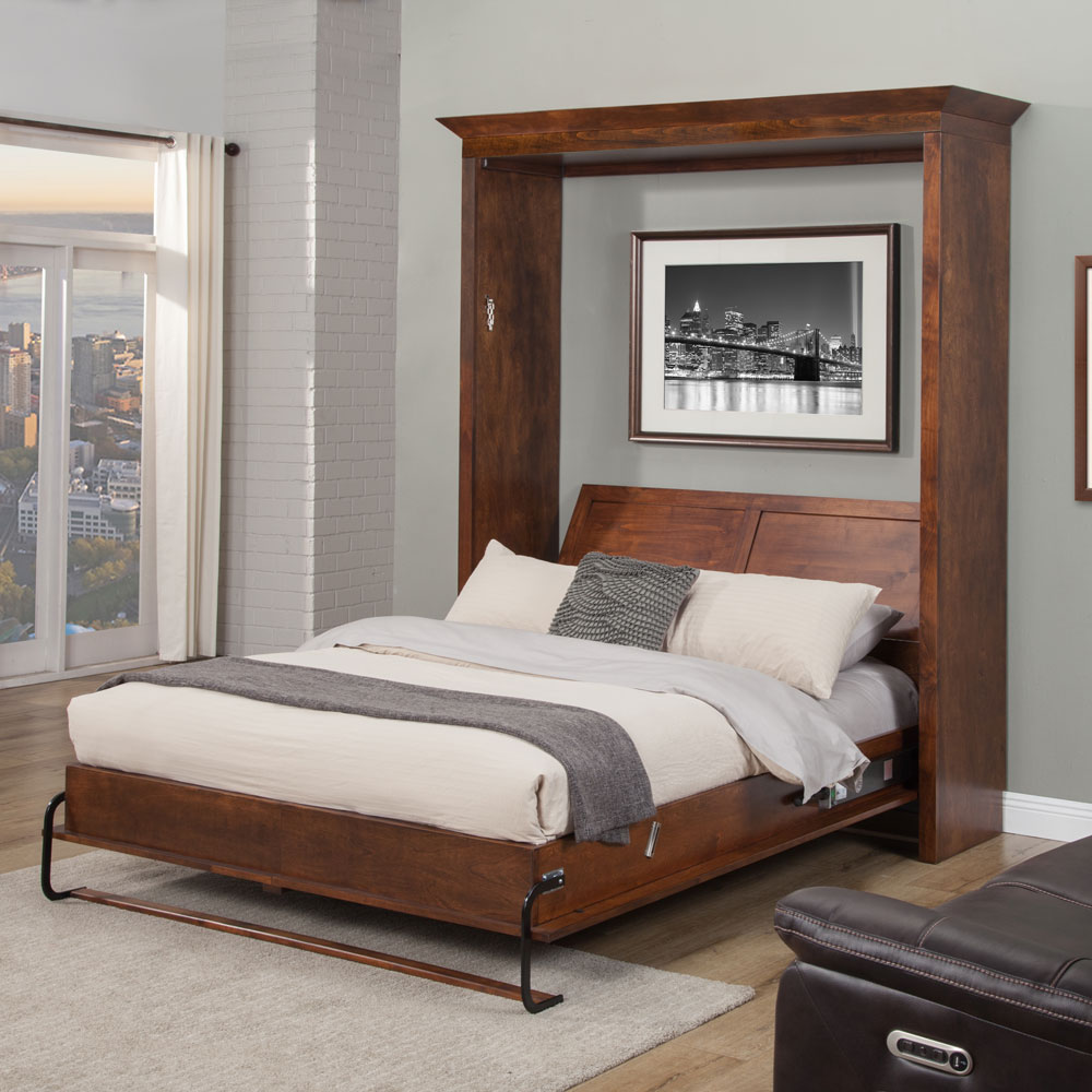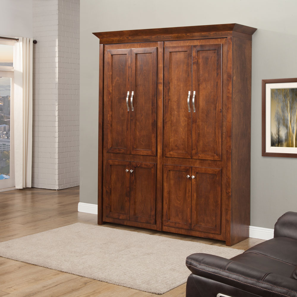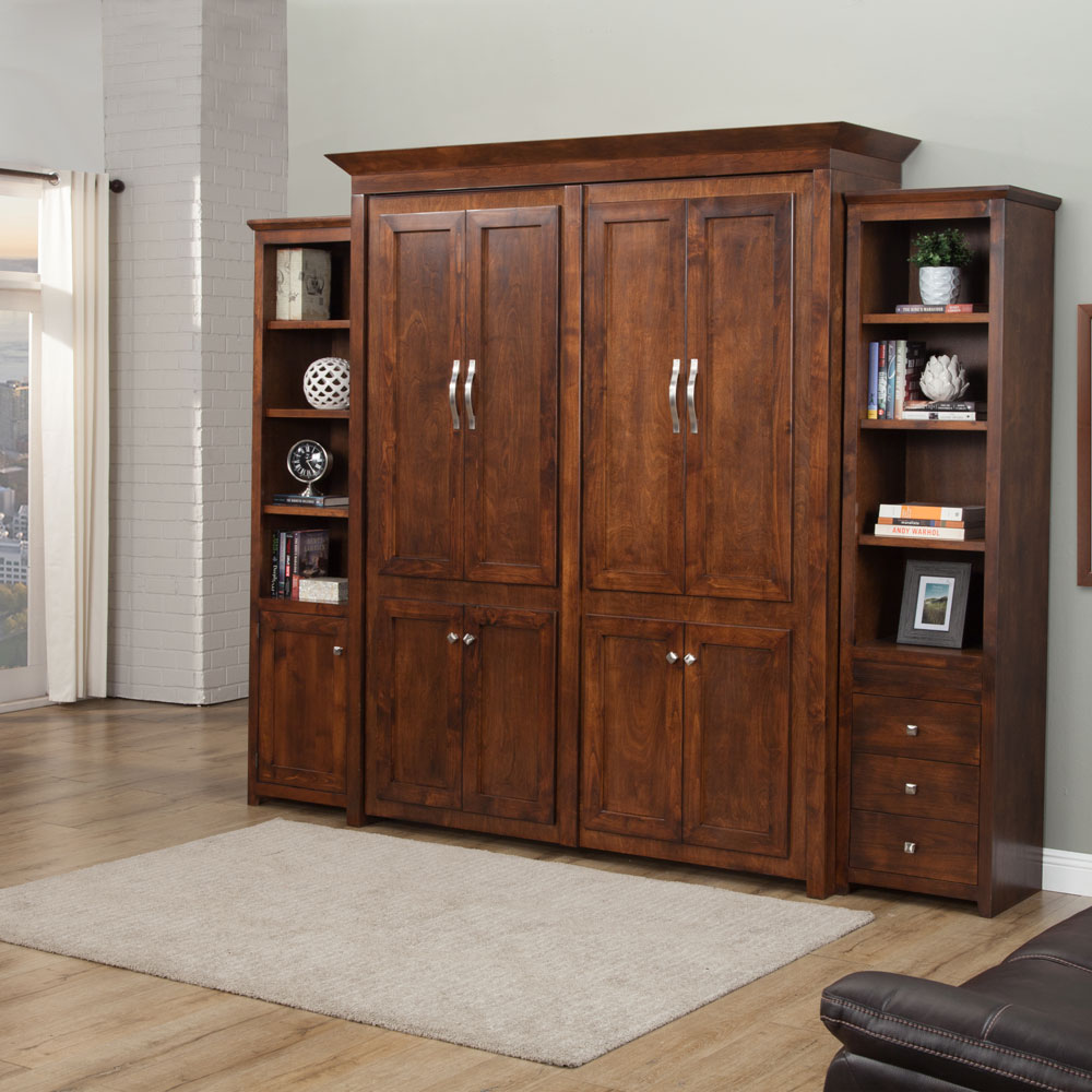 This beautifully crafted wallbed comes in full or queen. The Florence Wallbed has a rich, rustic look and in oak or alder wood. There are many finishes to choose from to match the decor of your home. There is also a wide selection of optional side cabinets and desks available that will complement your Florence Murphy bed. Piers can add storage for your guests while they stay or for you in as storage in your room or office. The Florence wallbed operates on a Selby mechanism, which is easy to open and close. The wrap around leg allows the front of the wallbed to look like a beautiful piece of furniture. The new Florence Murphy bed has beautiful crown molding and finishes to make it a wonderful addition to your home. This Murphy bed can hold up to an 11 inch mattress.